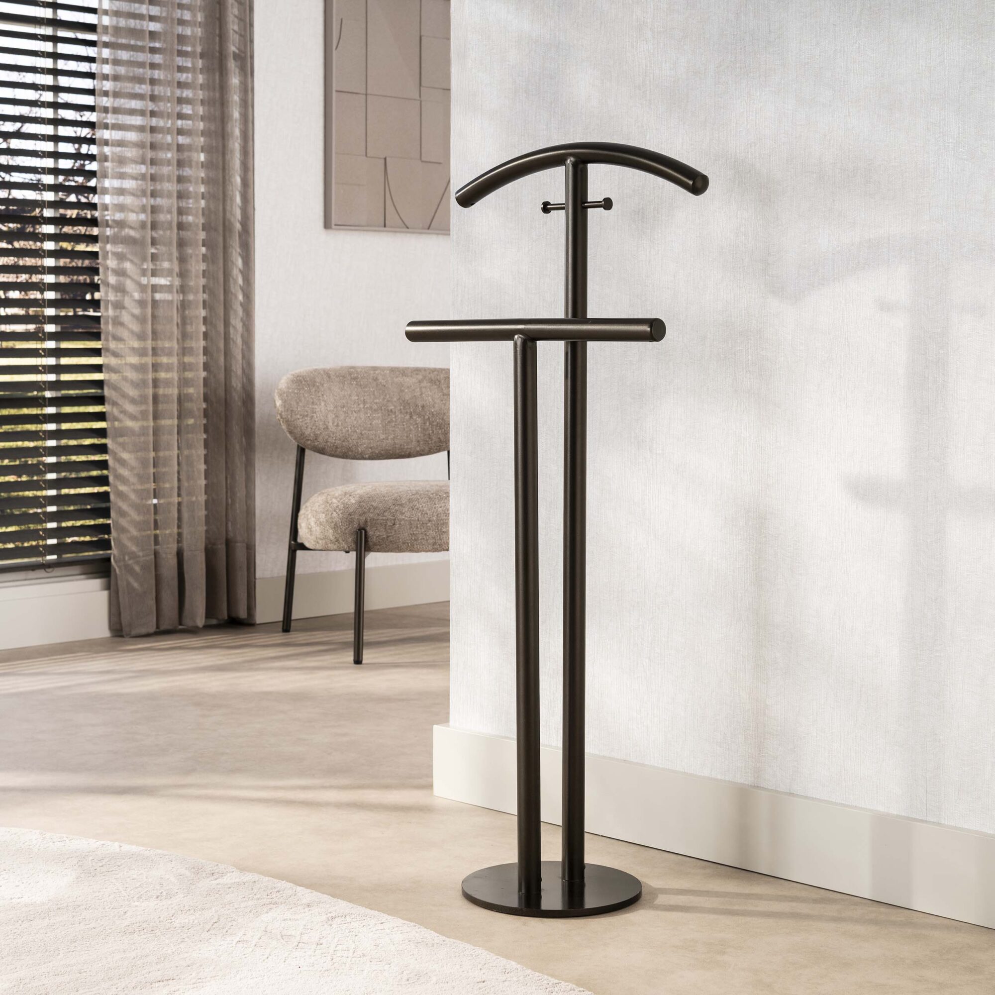 Dressboy Luno is gemaakt van gepoedercoat staal in brons. Het ontwerp biedt een praktische oplossing voor het ophangen en klaarleggen van kleding. Siliconen strips worden meegeleverd en kunnen worden opgeplakt om schuiven te voorkomen. Deze dressboy maakt deel uit van de Luno serie.