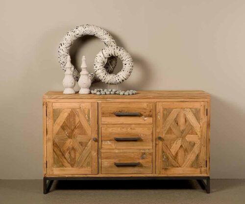 Collectie “Mascio” van Tower Living is gemaakt van prachtig massief teakhout. De fronten van de kasten en de tafelbladen zijn met de hand in mozaiekvorm ingelegd. Onderstel is gemaakt van donker staal