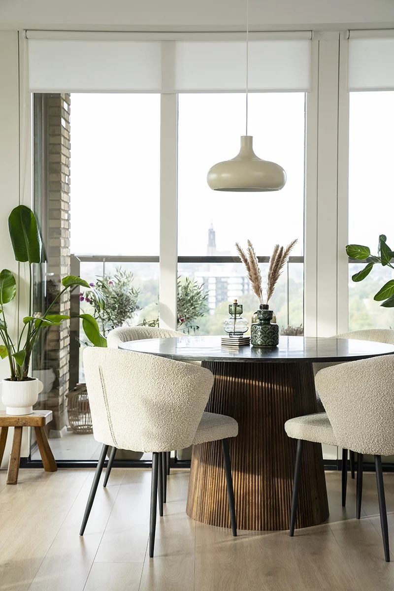 Nieuw in de collectie van Eleonora is de ronde eettafel Maxim. Een schitterende combinatie van een marmer blad met daaronder een houten poot gemaakt van donker mangohout. Dit geeft de tafel een eigentijds en speels karakter, welke dan ook weer helemaal past in vrijwel elk interieur. De Maxim is ook leverbaar als bijzet of salontafel.