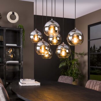 Deze eigentijdse hanglamp is een echte eye-catcher! De lamp is uitgevoerd in donker glas met 7 verschillende kapjes. Dankzij het donkere glas wordt de ruimte mooi en sfeervol verlicht. De kapjes zijn ieder tot 150 cm in hoogte verstelbaar en kunnen naar eigen inzicht speels opgehangen worden. Er wordt aanbevolen LED lichtbron (8463) te gebruiken.