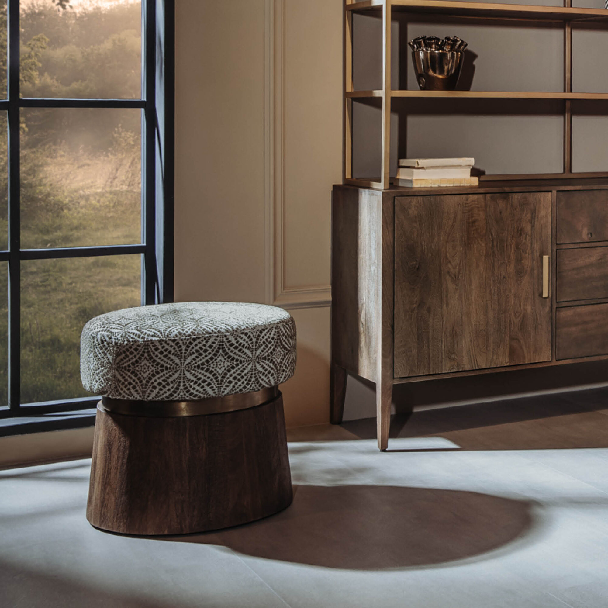 Hocker Ossana Metalen Ring Mangohout en stof – 50 cm