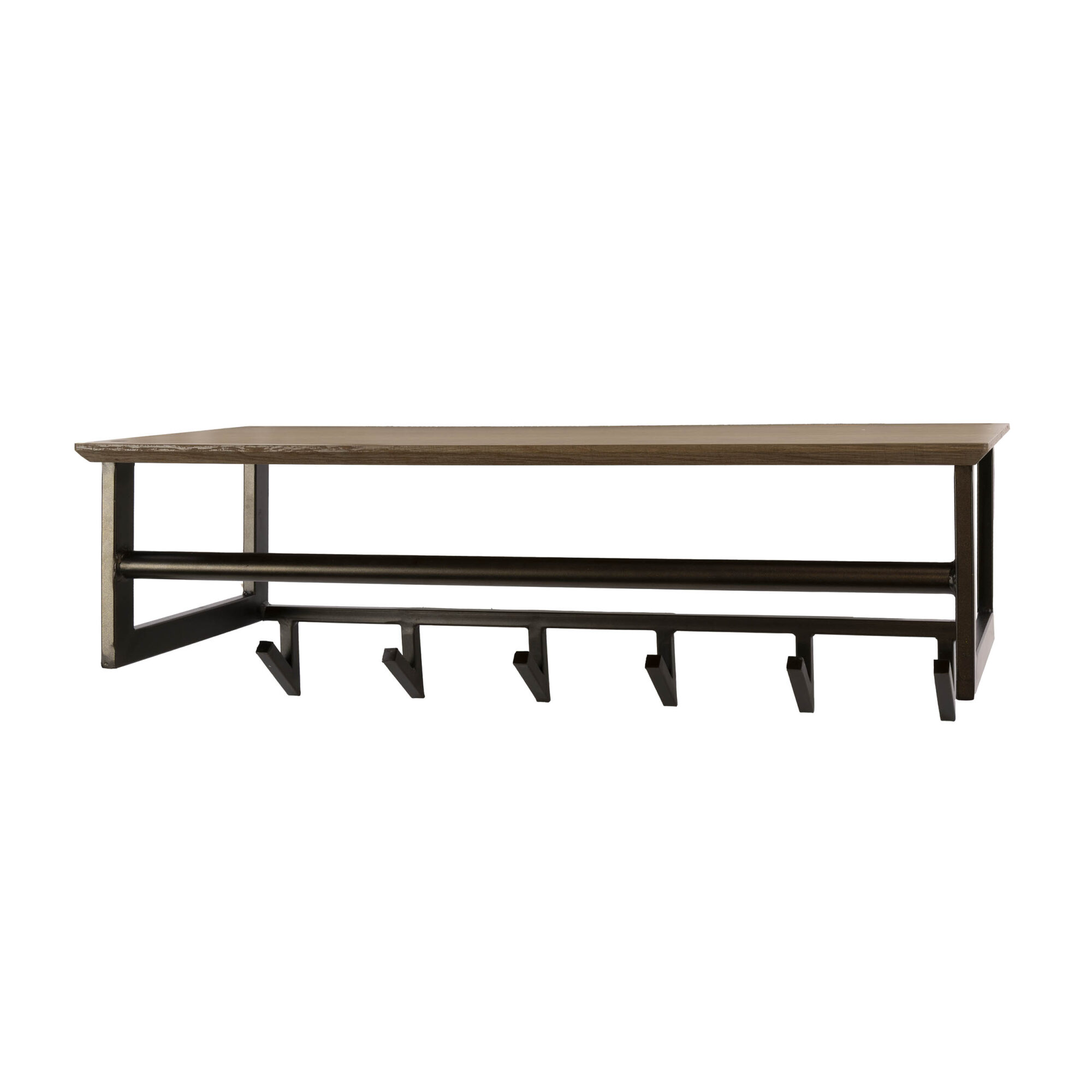 Kapstok Bruno bestaat uit een stalen frame, gepoedercoat in brons. Het strak vormgegeven ontwerp is voorzien van een eikenhoutlook hoedenplank, een roede en zes haken voor het ophangen van jassen en accessoires. Dit artikel maakt deel uit van de Bruno serie.