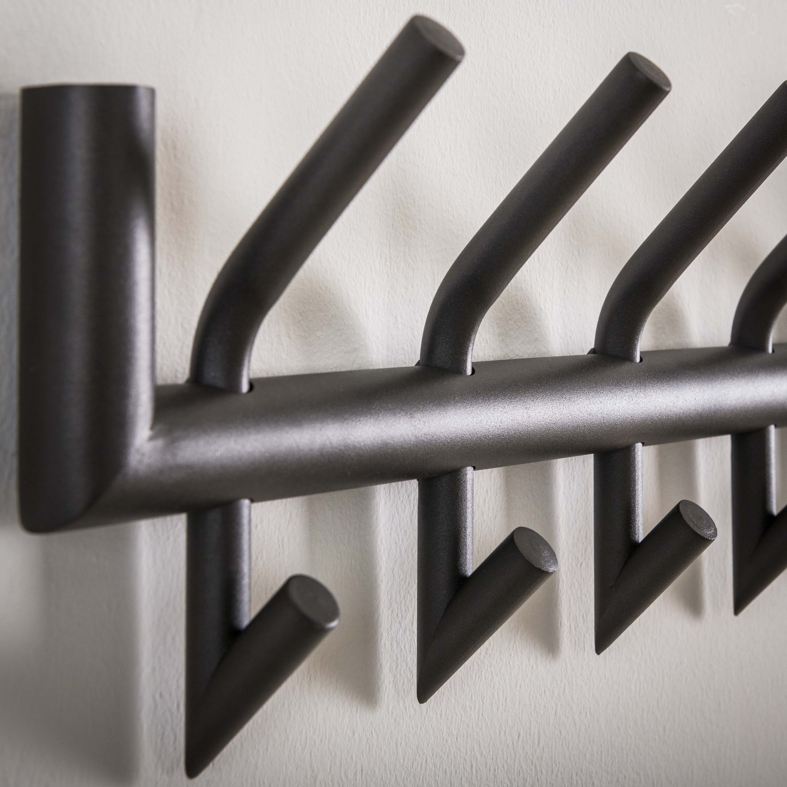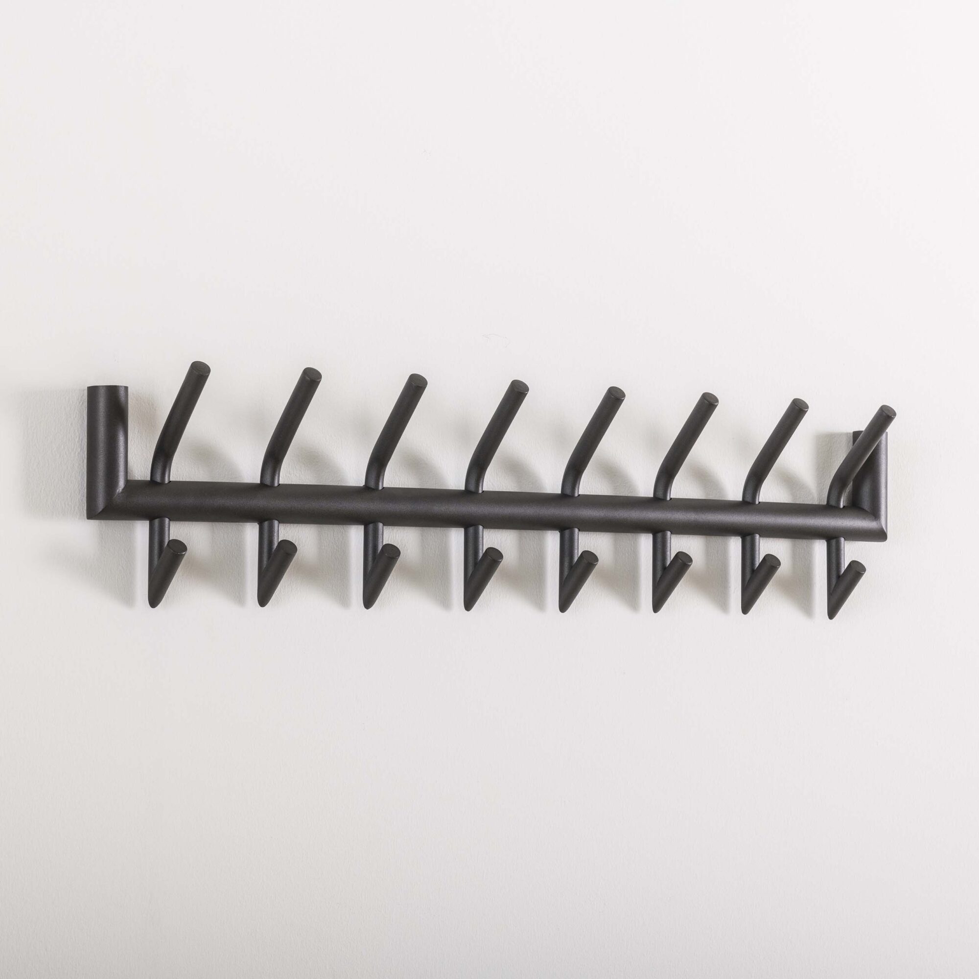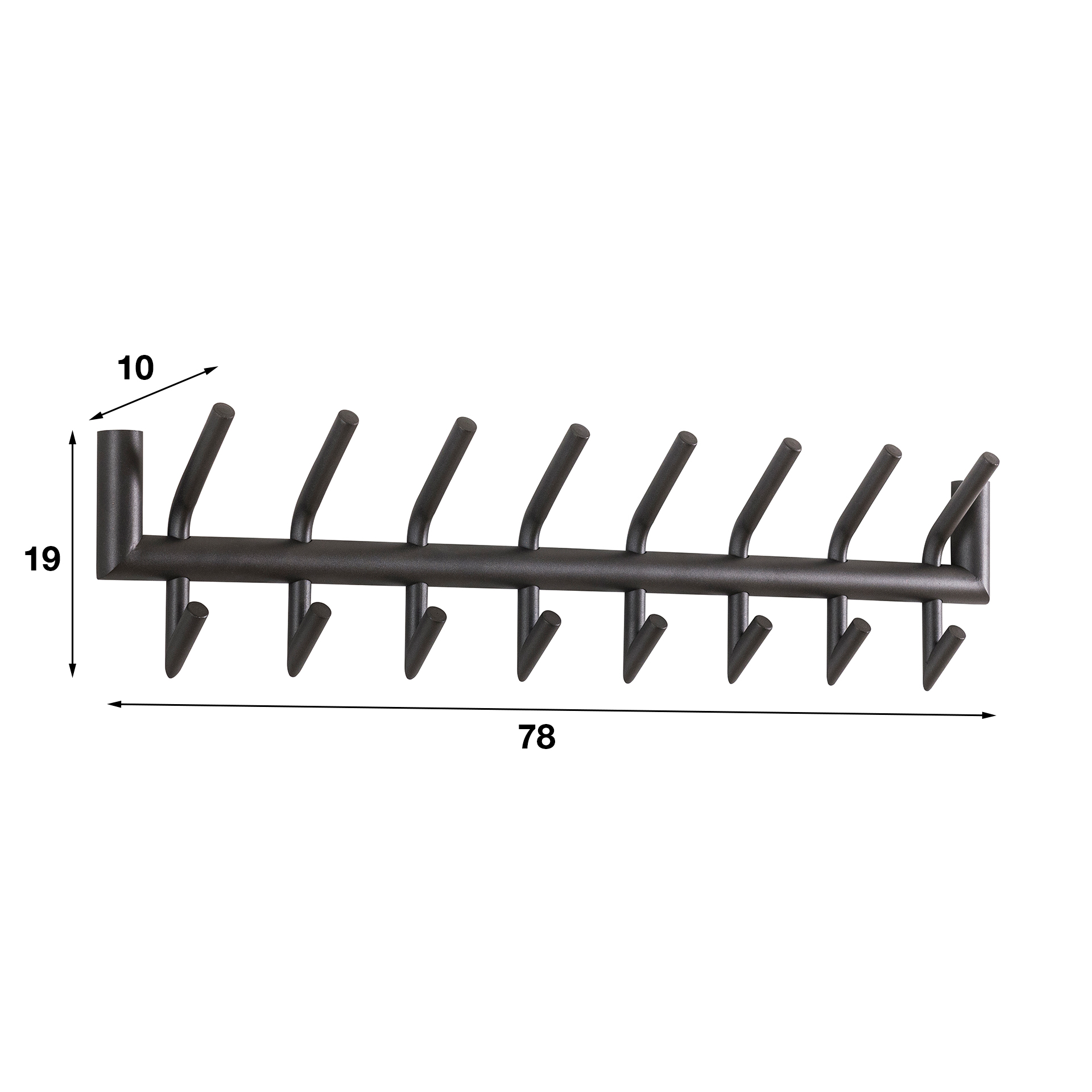 Deze kapstok heeft een ronde buis, uitgevoerd in donkergrijs mat gepoedercoat staal. In totaal heeft dit model 8 gelaste haakjes, die zowel aan de bovenkant als aan de onderkant een ophangmogelijkheid hebben. De stoere kapstok wordt opgebouwd geleverd. Vervolgens is hij middels 2 bevestigingsogen eenvoudig aan de wand te monteren.