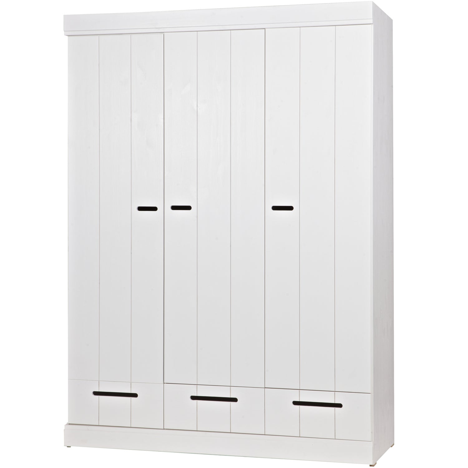 Ontdek de Kledingkast Connect met 3 deuren en 3 laden in stijlvol wit, een echte blikvanger in jouw interieur. Deze kast, gemaakt van massief grenenhout, combineert robuustheid met elegantie. De ingelegde strokendeuren en stevige metalen ladegeleiders zorgen voor een stoere uitstraling en praktische opbergruimte. Met een hoogte van 195 cm, breedte van 140 cm en diepte van 53 cm, biedt deze kast voldoende ruimte voor al je kleding en accessoires.
