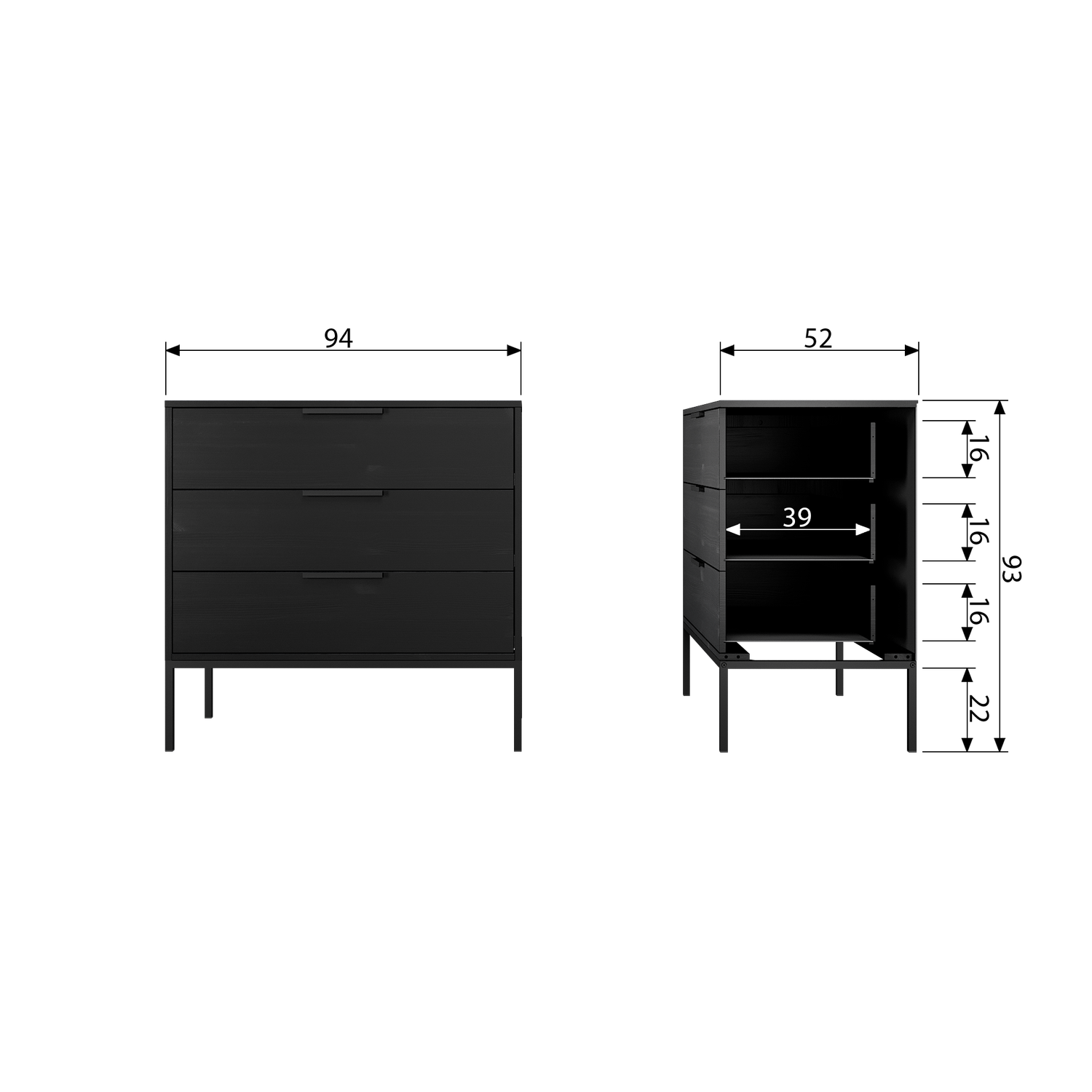 Met zijn afmetingen van 94×93 cm past Adam perfect in elke kamer, van de slaapkamer tot de hal. De matzwarte poedercoating op het onderstel en de handvaten geven een strakke, eigentijdse look die moeiteloos te combineren is met diverse woonstijlen. Of je nu houdt van industrieel, Scandinavisch of modern, deze ladekast voelt zich overal thuis.
