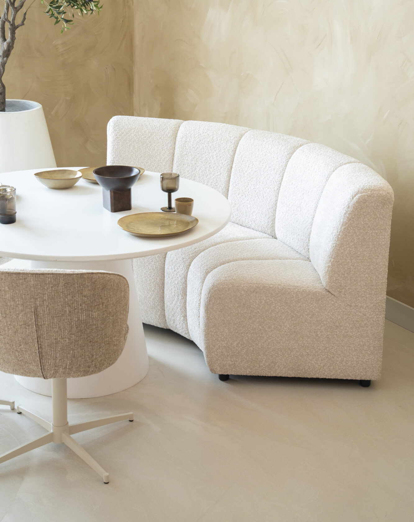 Heb je een ronde of ovale eettafel? Dan is eetkamerbank Esther precies wat je zoekt. Esther stel je namelijk samen in jouw ideale rechte of ronde opstelling. Met haar tot aan de grond doorgestoffeerde design en subtiele sierstiksels op de rugleuning en zitting kies je voor een luxe uitstraling en urenlang comfortabel tafelen.