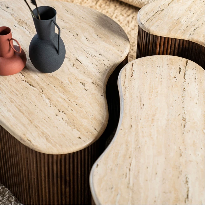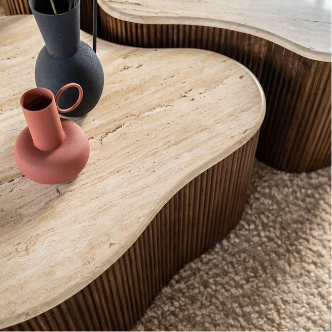 Bestel de Eleonora Salontafel Mari Mangohout en Travertin online en ontvang de Salontafel Mari dezelfde week in huis.