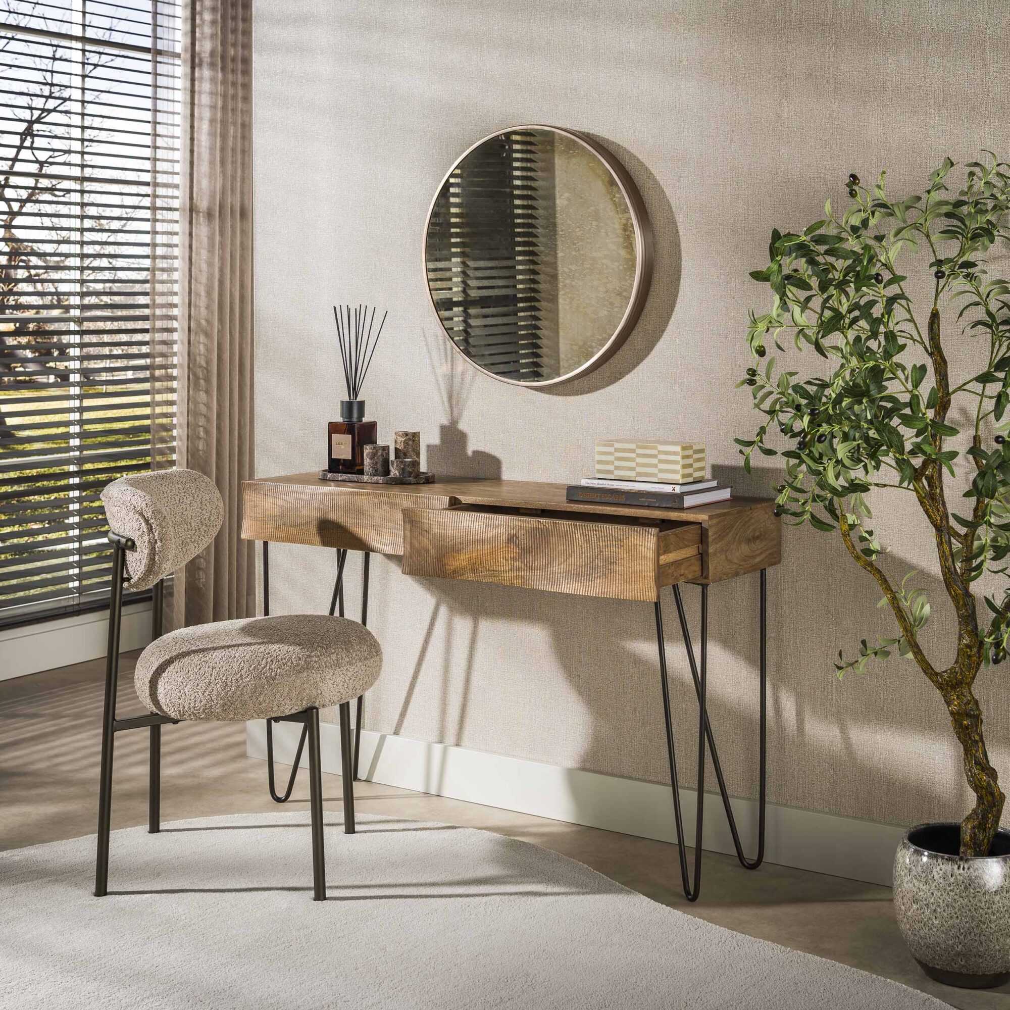 | Materiaal | Massief mangohout in een zandkleurige finish en hairpin frame van metaal in bronze kleur |