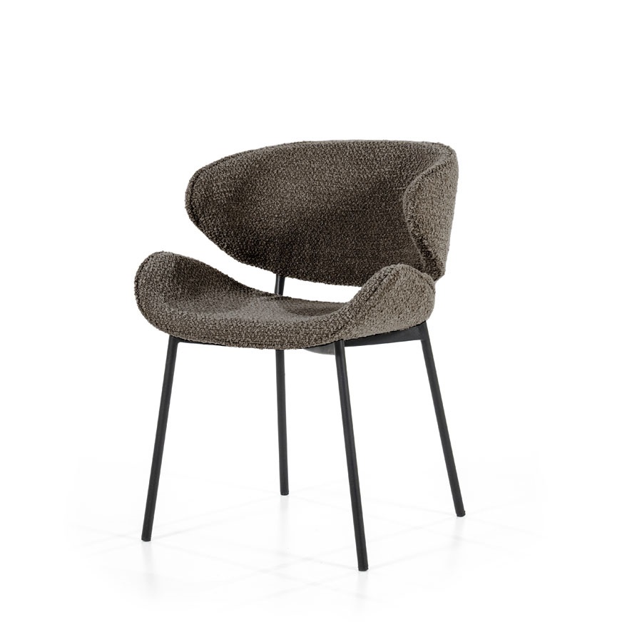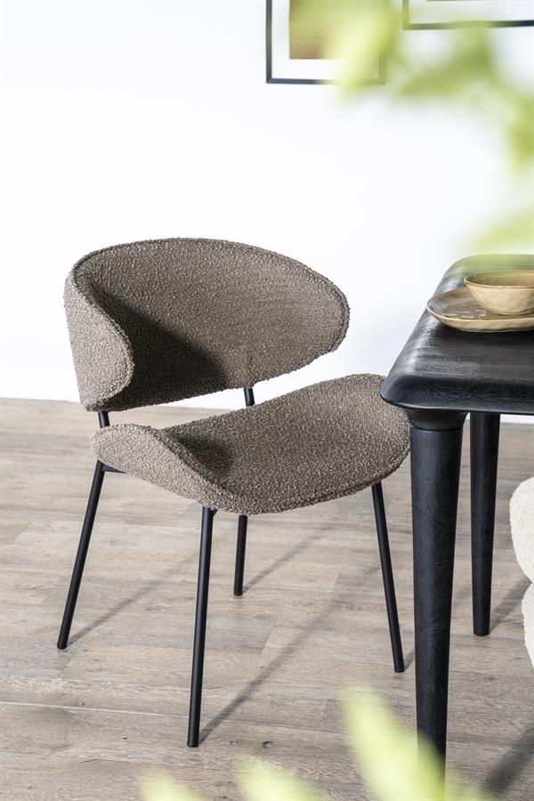 Stoel Tess is nieuw in de collectie van Eleonora. De eetkamerstoel Tess heeft een Scandinavisch uiterlijk dankzij haar ergonomische vormen in combinatie met de Spark bouclé stof.